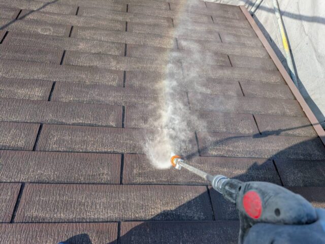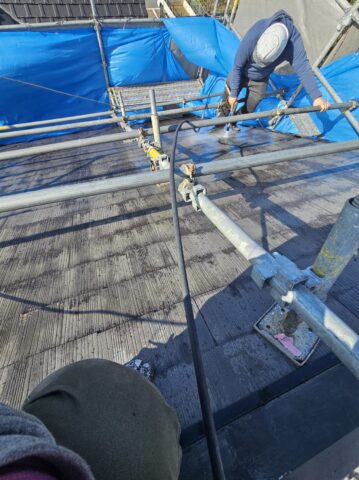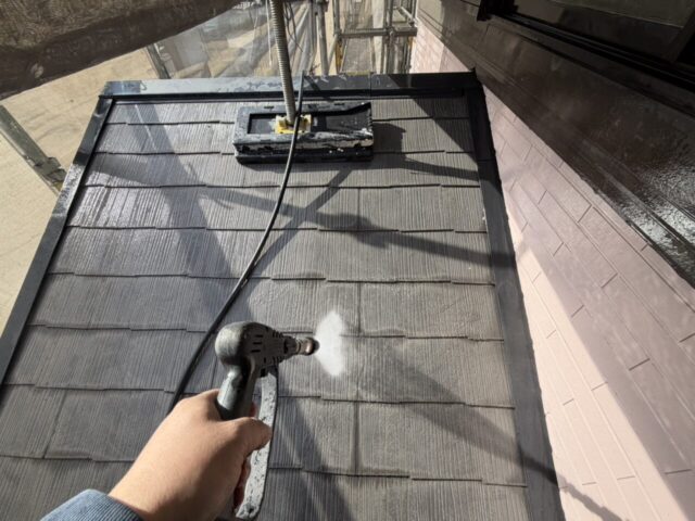↓屋根の高圧洗浄 屋根はカバー工事(重ね葺き)を行うので、高圧洗浄は不要なのですが、汚いまま蓋をするのは 気持ちが許さないので、ペンターテイナーでは 屋根工事の際も高圧洗浄を行ってから屋根工事を進めます🫡
