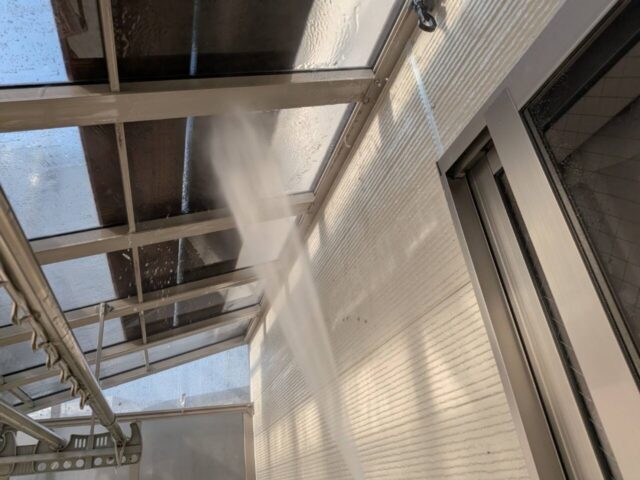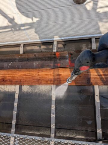 ↑テラス天井 高圧洗浄中 蜘蛛の巣やらホコリやら 地味に気になるので🕸わたし個人的には これはすごく嬉しいサービス作業です🫡
