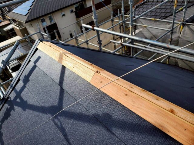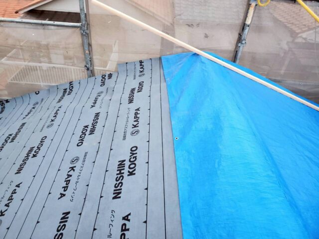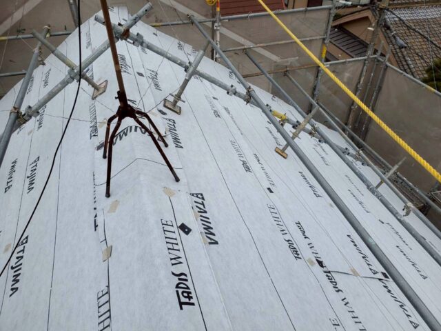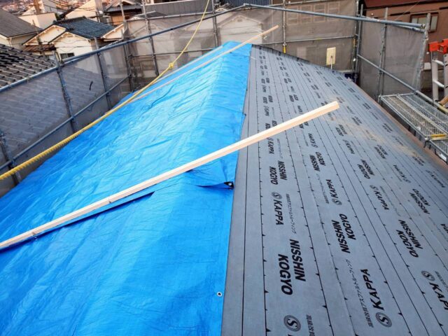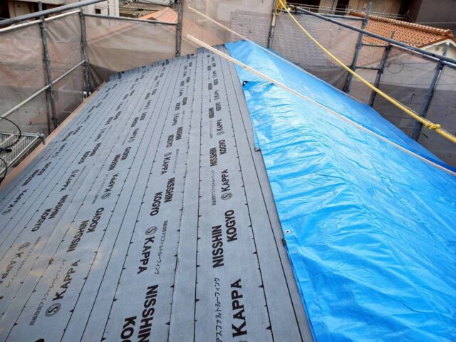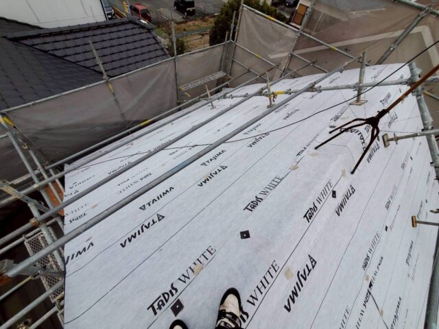 次に行うのが ルーフィング(防水シート)施工です🚿✨屋根の防水性能は 実は 瓦や屋根材よりもこのシートが命🙋♀️💡
