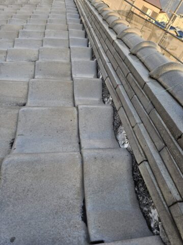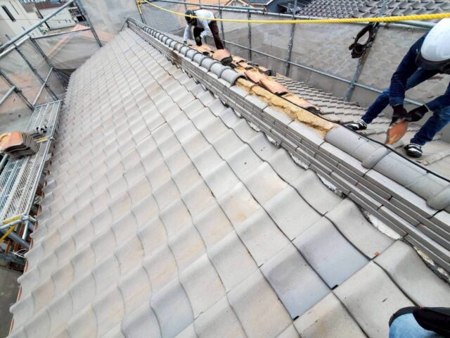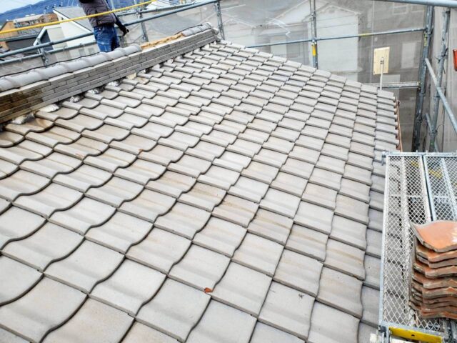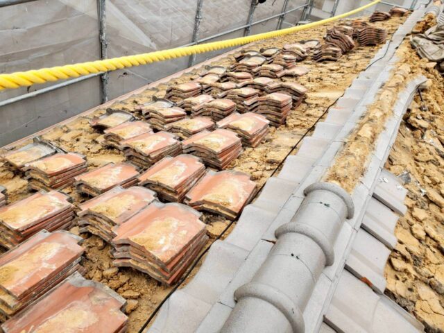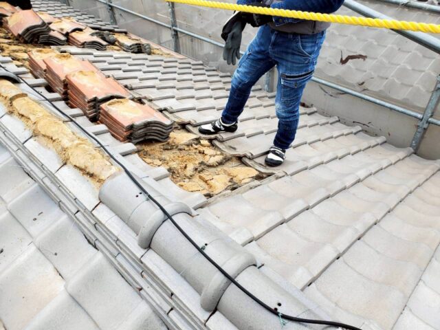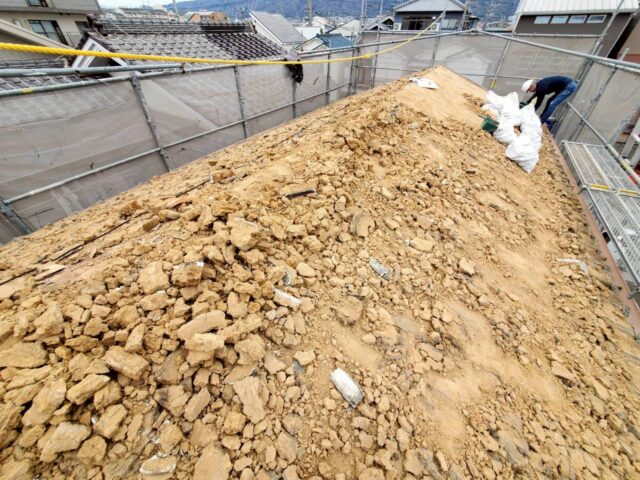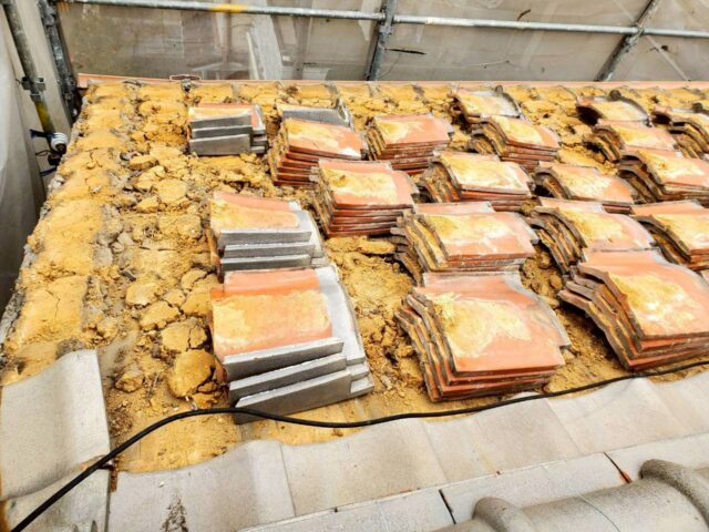 【↓↓↓屋根工事】今回は葺き替え工事です👷🏻♀️🧱 既存屋根材の撤去作業 まずは、長年使用されていた既存の屋根材を一枚一枚丁寧に撤去していきます👷♂️💦屋根の下地が見えるまでしっかり剥がすことで