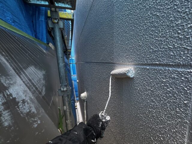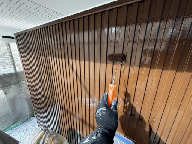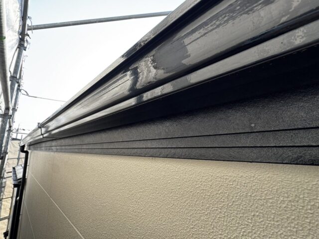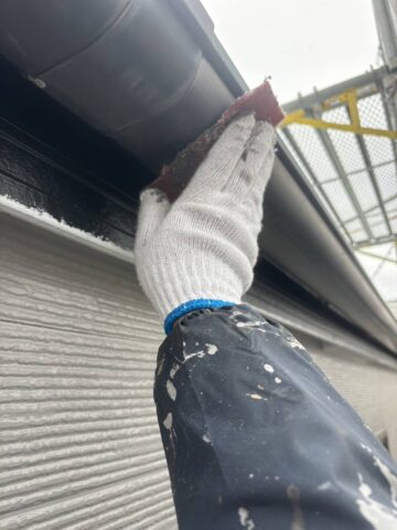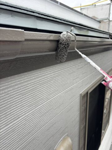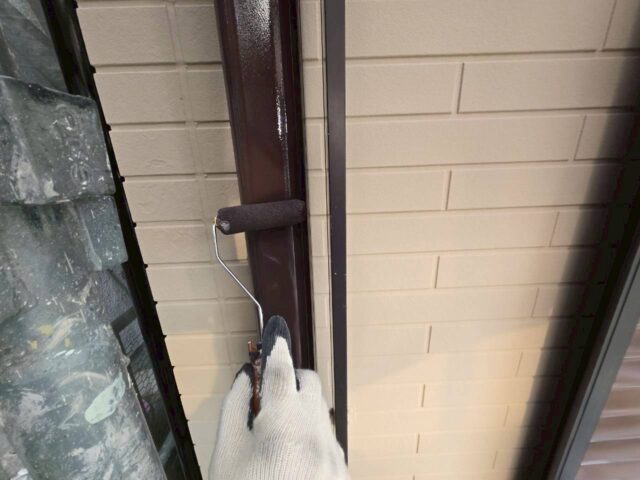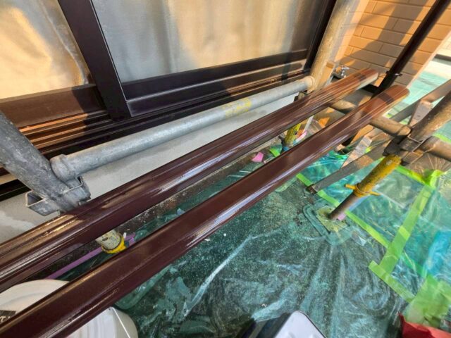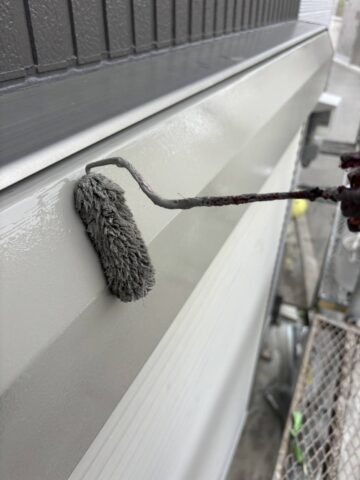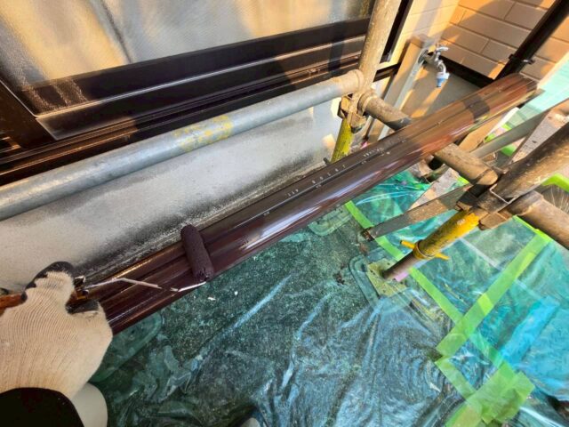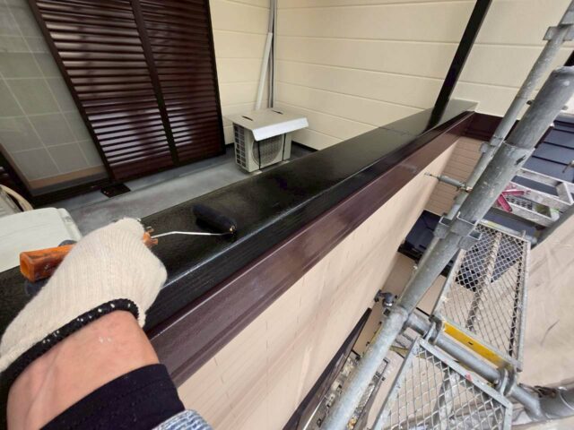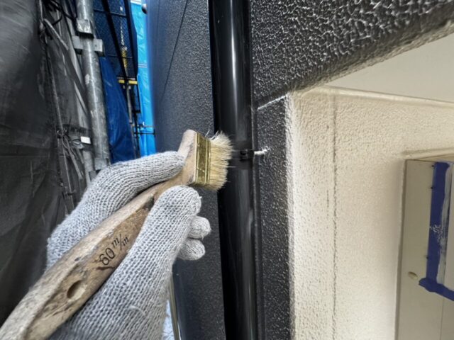 ↑📸【写真:軒どい2回目上塗り作業の様子】