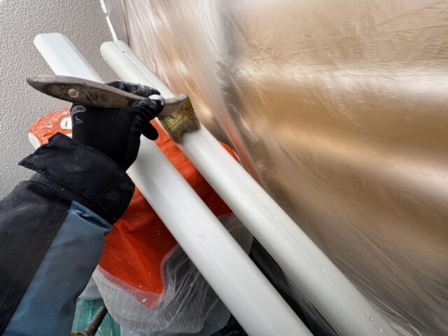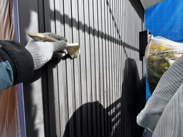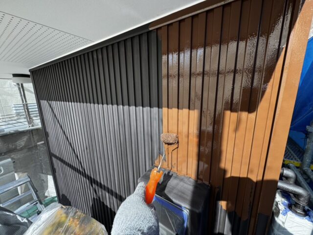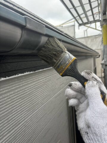↑📸【写真:軒どい1回目上塗り作業の様子】