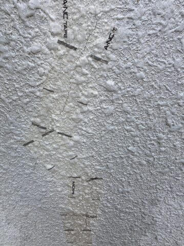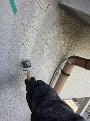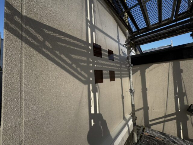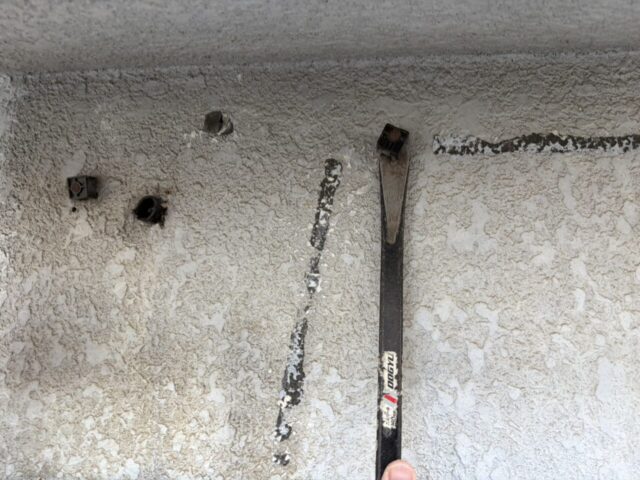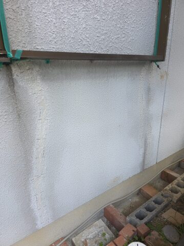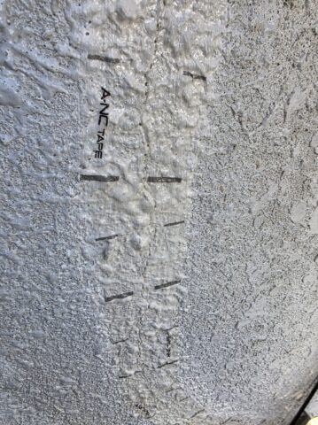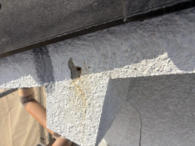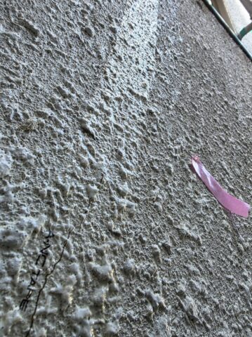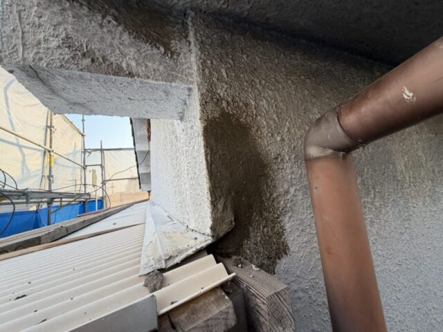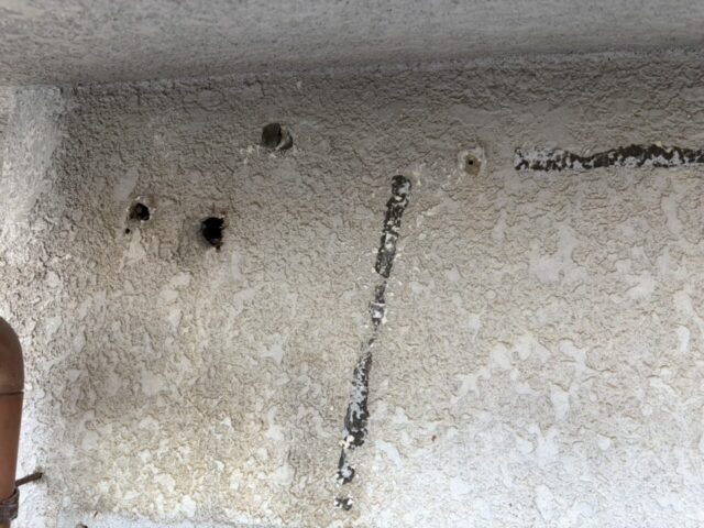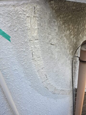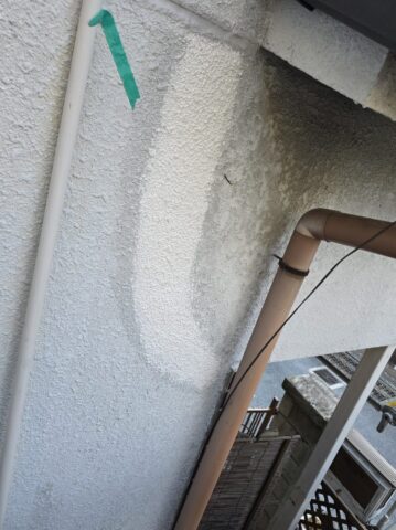 ↑📸【写真:外壁ひび割れからの欠損箇所 補修モルタル補修完了】
