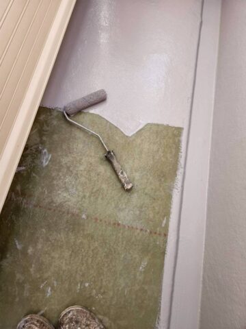 ↑📸【写真:バルコニー土間(床)プライマー塗布の様子】トップコートとの密着を良くするための接着剤のような役割の塗料になります💁︎🤍