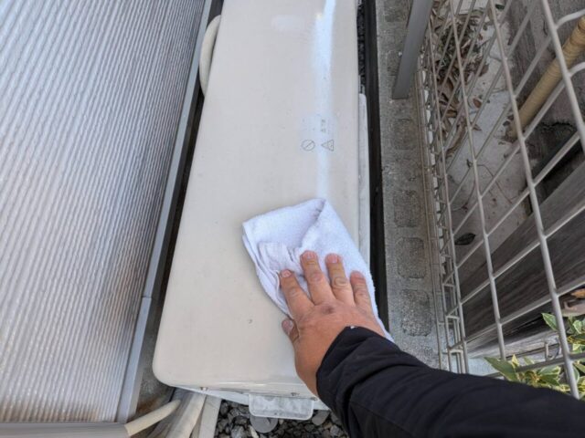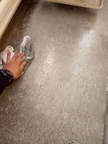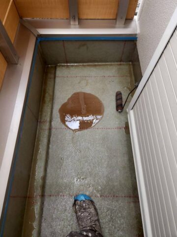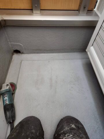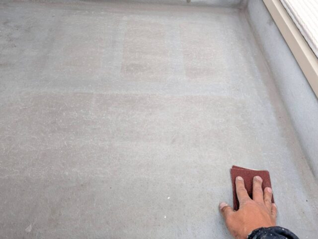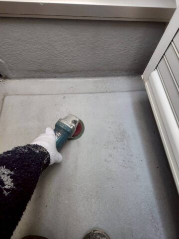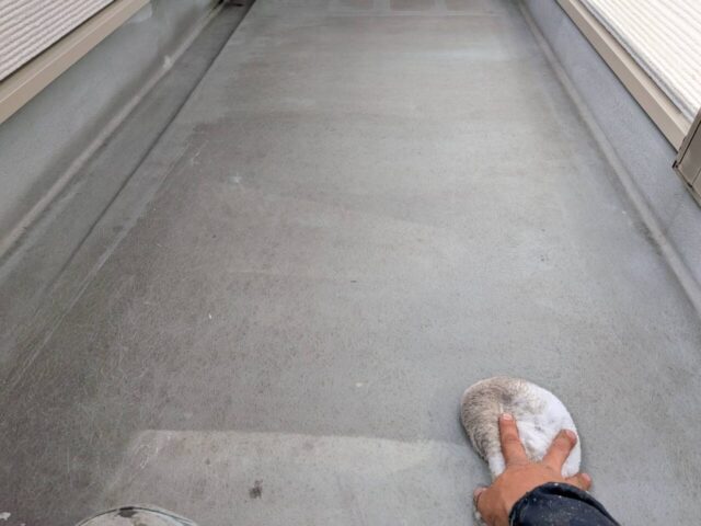 ↑📸【写真:バルコニー土間(床)脱脂作業の様子】油分を取り除き 密着を高める役割のある大切な工程になります✌️