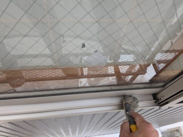 ↑📸【写真:庇(霧よけ) シーリング打設前の清掃作業の様子】