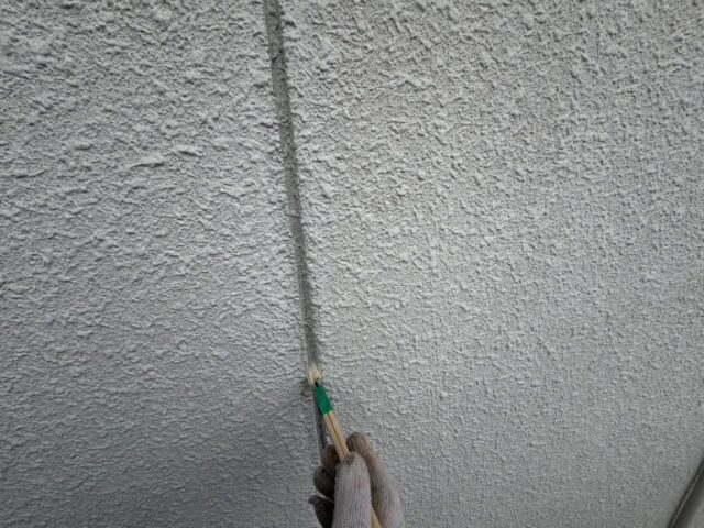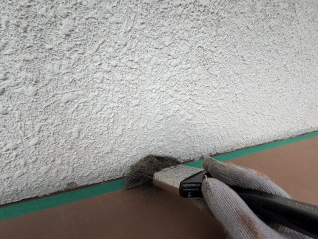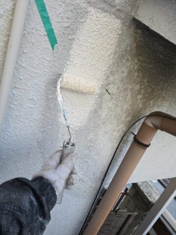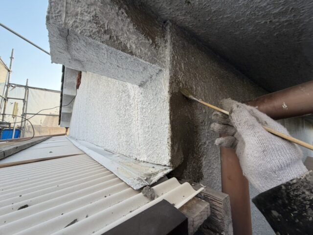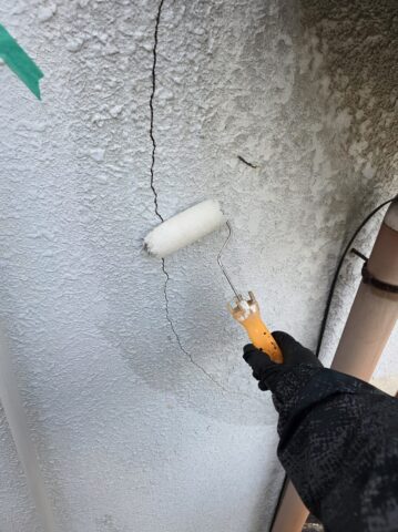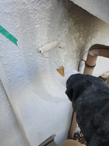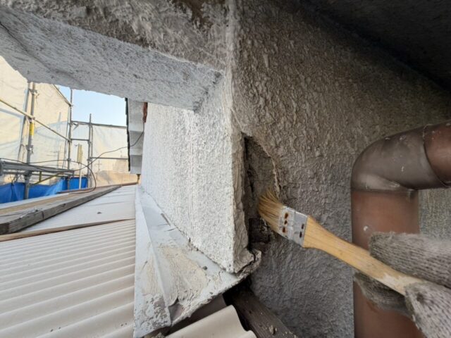 ↑📸【写真:外壁ひび割れからの欠損箇所 補修下塗り(シーラー)塗布作業の様子】
