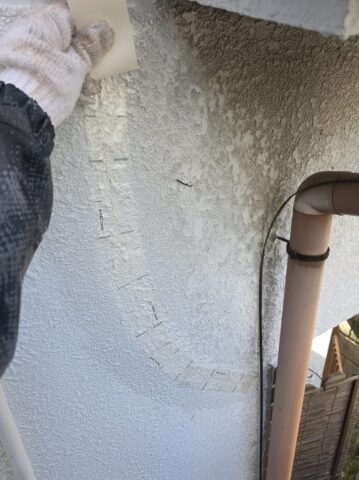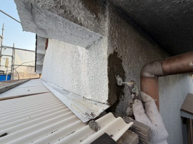 ↑📸【写真:外壁ひび割れからの欠損箇所 補修モルタル塗布作業の様子】