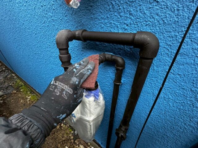 ↑📸【写真:ガス配管 ケレン作業後の清掃の様子】