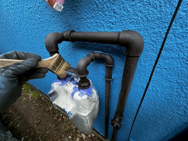 ↑📸【写真:雨どい 1回目上塗り塗布作業の様子】