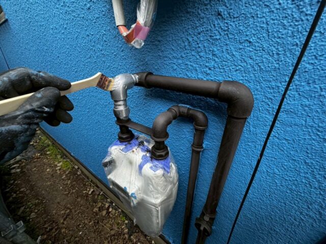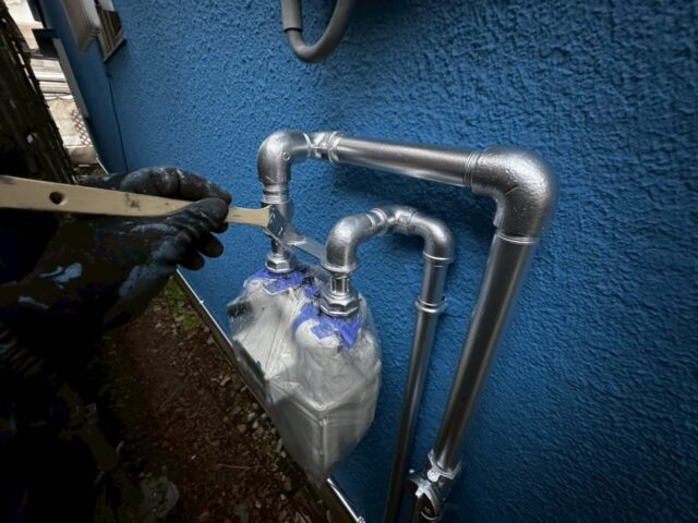 ↑📸【写真:ガス配管 アルミニウムペイント2回目上塗り塗布作業の様子】