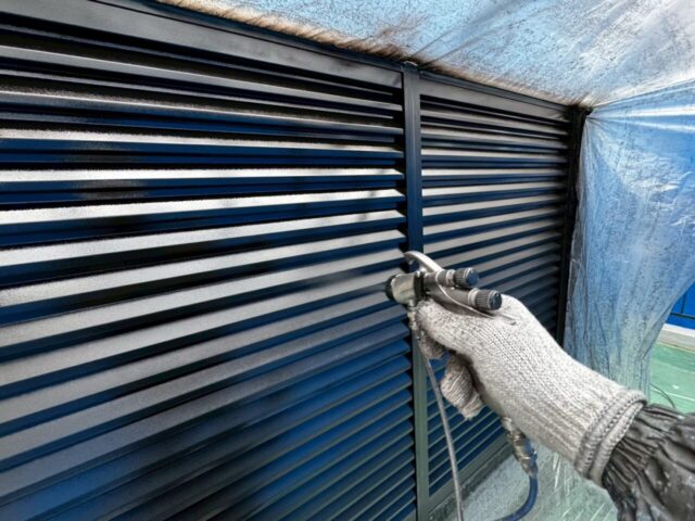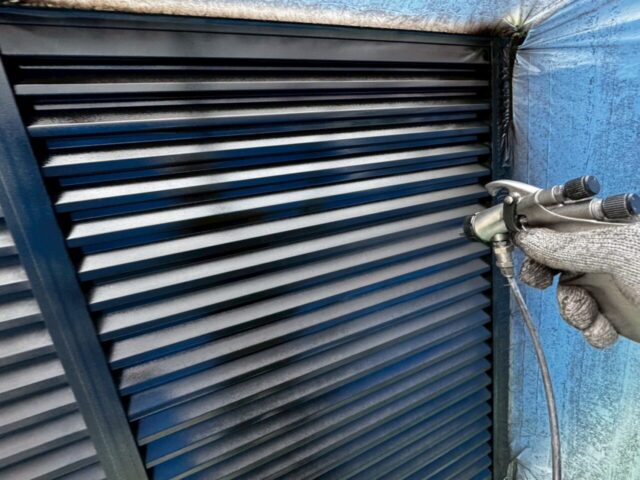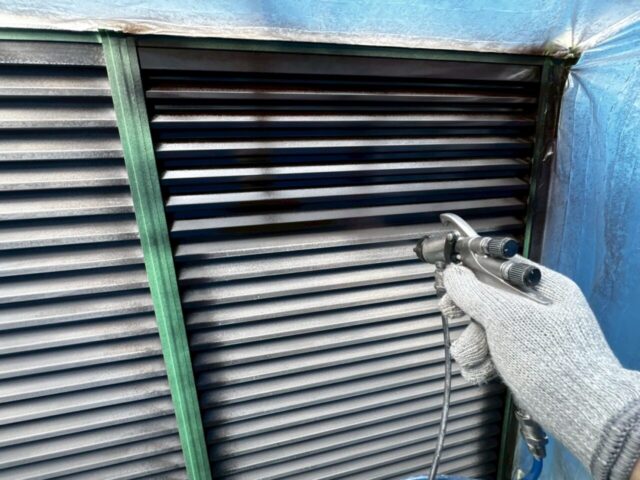 ↑📸【写真:雨戸 1回目上塗り 吹き付け作業の様子】