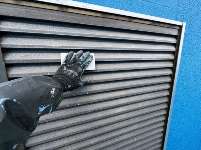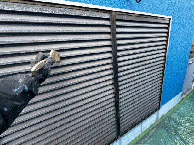 ↑📸【写真:雨戸 鉄部下塗り(錆止め)吹き付け作業の様子】