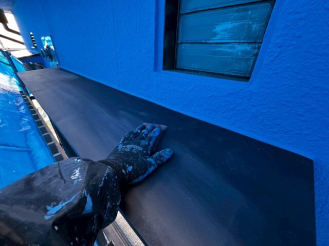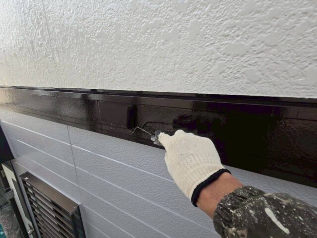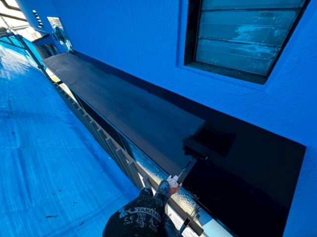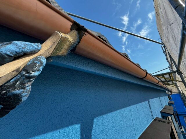 ↑📸【写真:軒どい 1回目上塗り作業の様子】