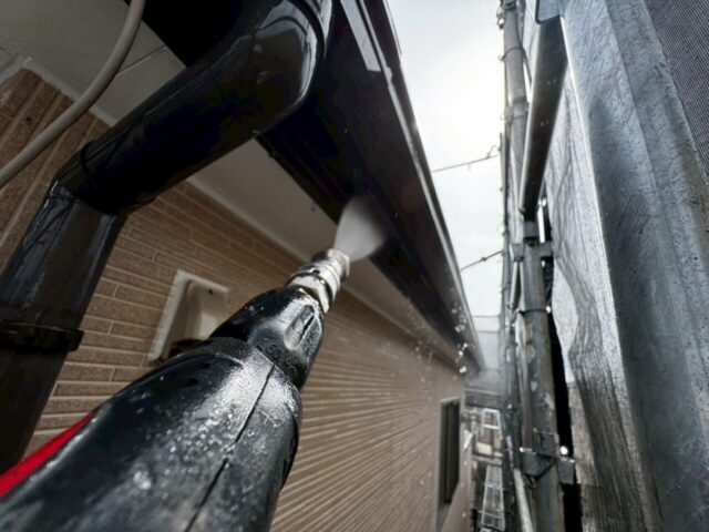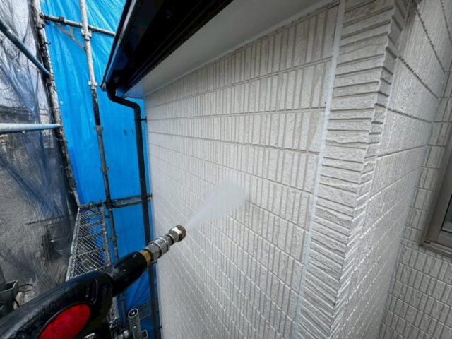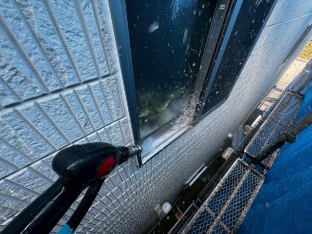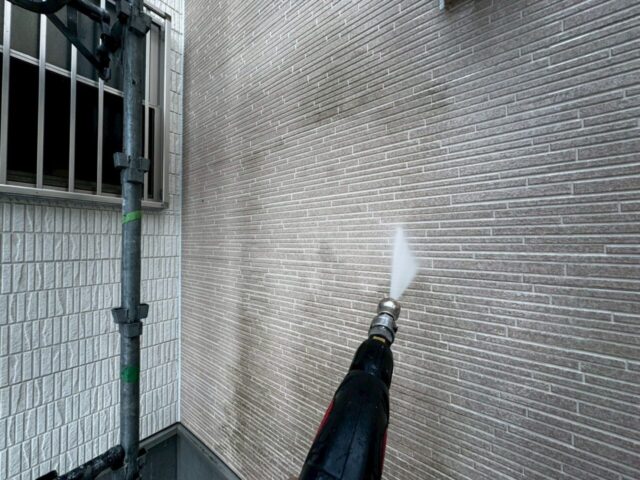 ↑📸【写真:外壁 高圧洗浄中の様子】
