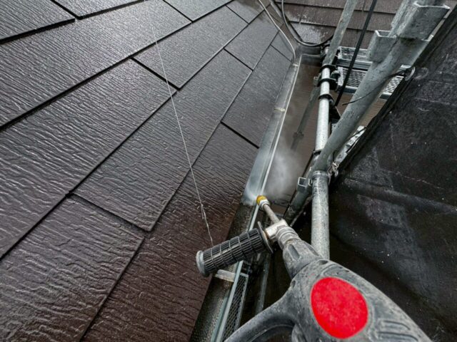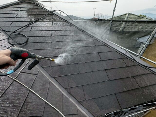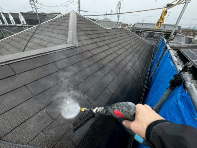 ↑📸【写真:屋根 高圧洗浄中の様子】