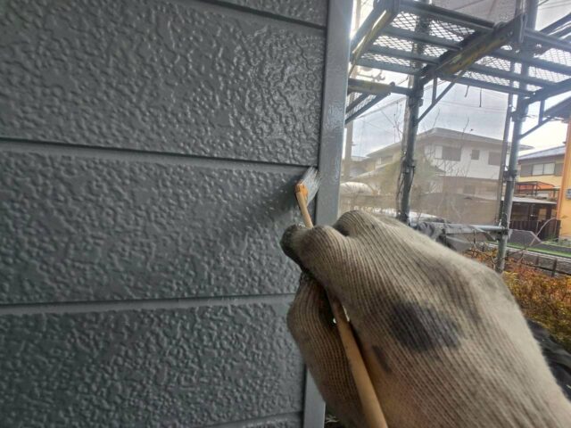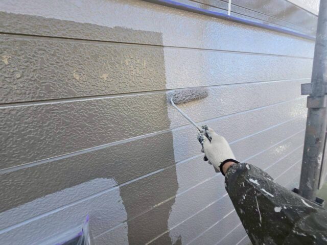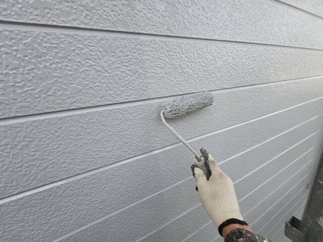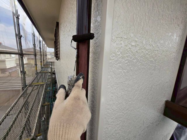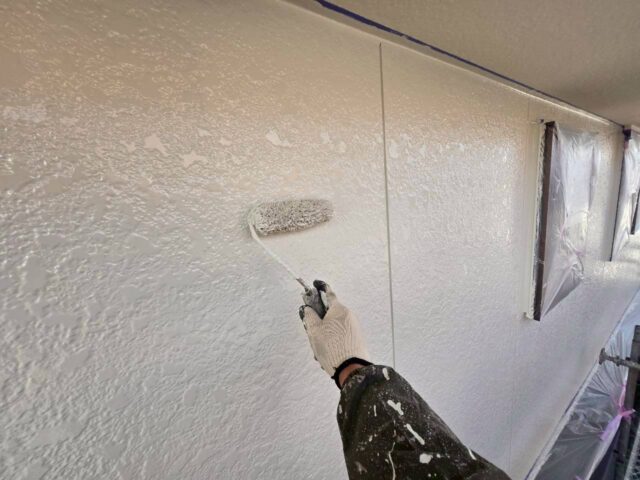 ↑📸【写真:外壁 中塗り塗布作業の様子】